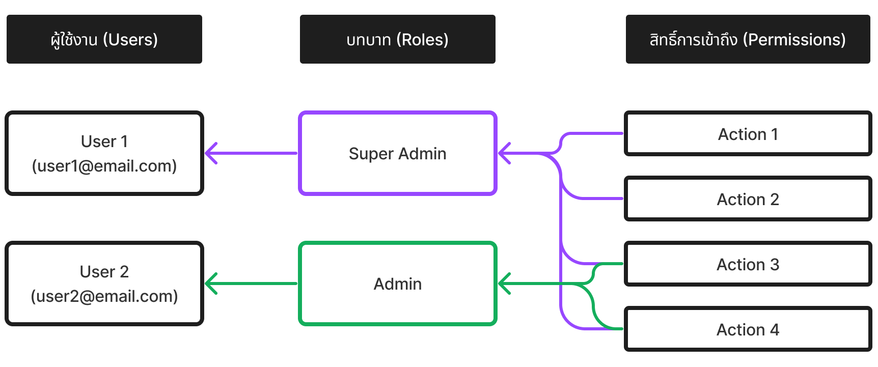 ผู้ใช้งานแต่ละคน จะได้รับมอบหมาย บทบาท เพียงหนึ่งเดียว โดยบทบาทนี้จะประกอบด้วยหลาย สิทธิ์การเข้าถึง
