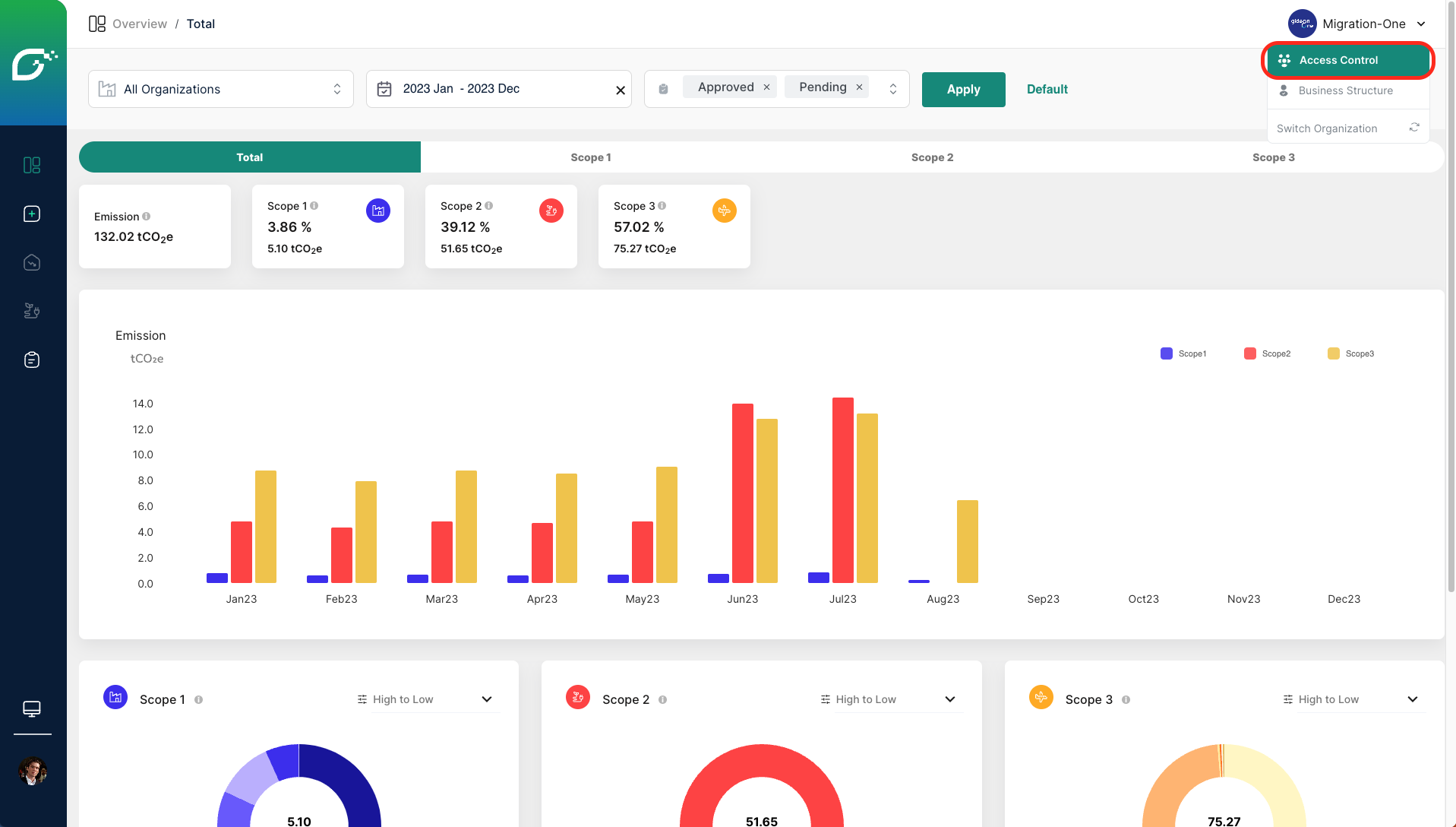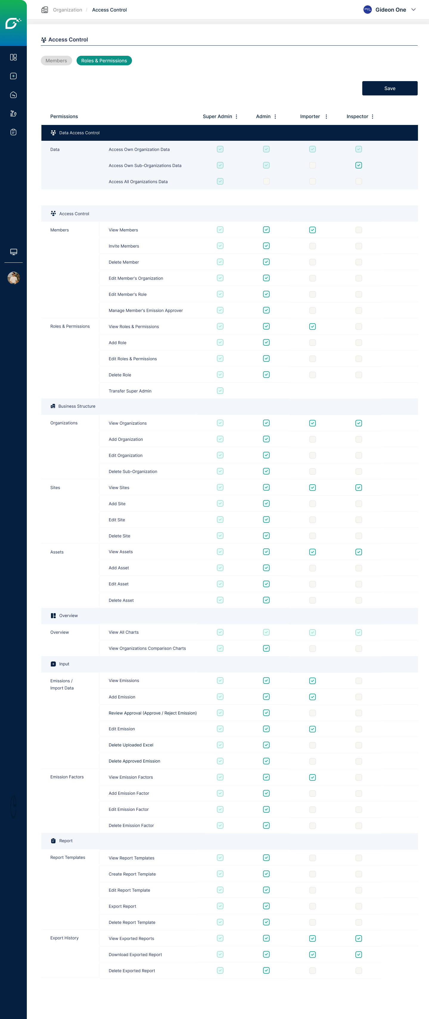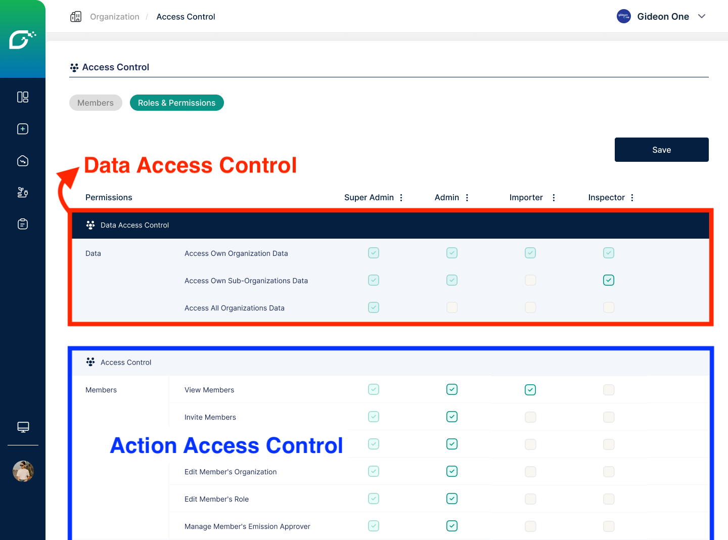 ผู้ใช้งานแต่ละคน จะได้รับมอบหมาย บทบาท เพียงหนึ่งเดียว โดยบทบาทนี้จะประกอบด้วยหลาย สิทธิ์การเข้าถึง หรือ สิ่งที่ผู้ใช้งานนั้นกระทำได้ ตัวอย่างสิทธิ์การเข้าถึง เช่น ดู / เพิ่ม / แก้ไข / ลบ รายการการปล่อย GHGs โดยบทบาทที่ 1 อาจทำได้ทั้ง 4 สิทธิ์การเข้าถึงนี้ แต่บทบาทที่ 2 ทำได้เพียง 2 สิทธิ์การเข้าถึง