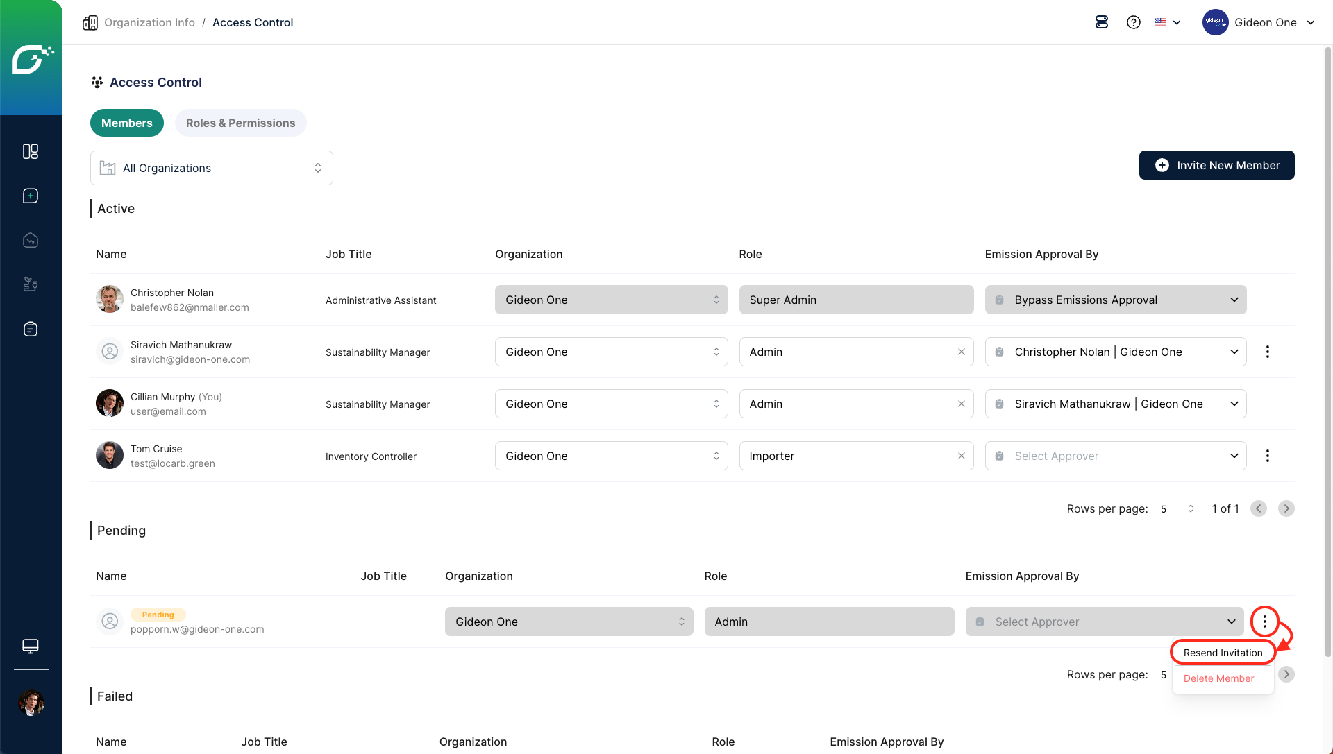 กรณีที่เกิดข้อผิดพลาดในการส่งอีเมลคำเชิญ รายชื่อของผู้ถูกเชิญจะขึ้นสถานะ Failed โดยสามารถกดเครื่องหมาย ! เพื่อดูสาเหตุได้ คุณสามารถคลิกที่ไอค่อนเคบับ หลังชื่อสมาชิกที่ต้องการ แล้วคลิก ส่งคำเชิญอีกครั้ง (Resend Invitation) โดยเปลี่ยนอีเมลผู้ถูกเชิญได้ หรือคลิก ลบสมาชิก (Delete Member) หากต้องการยุติคำเชิญ